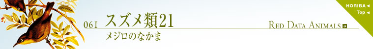 その名のとおり目のまわりにある白い羽毛の輪が特徴。小さなカップ型の巣をつくり、くちばしを果実に突き入れ、舌で果汁を吸うメジロは、西洋よりもむしろ東洋で愛玩されてきた。日本では、これを捕らえるには、鳥もちのそばに好物の熟柿を置いておくとよいとされた。 そのなかまは、旧世界の温帯・熱帯を中心に約80種が分布している。